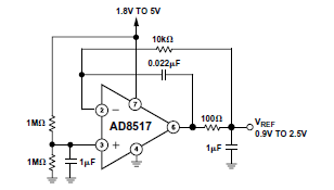 許多單電源電路被配置成偏置到電源電壓的一半。在這些情況下,可以用通過放大器緩沖的分壓器創(chuàng)建假接地基準(zhǔn)電壓。圖3即為這種電路的電氣原理圖。兩個(gè)1 M電阻產(chǎn)生基準(zhǔn)電壓,同時(shí)僅從1.8 V電源汲取900 nA電流。從反相端連接至運(yùn)算放大器輸出端的電容提供補(bǔ)償,使旁路電容可以連接在基準(zhǔn)輸出端。該旁路電容有助于為基準(zhǔn)輸出建立交流接地。