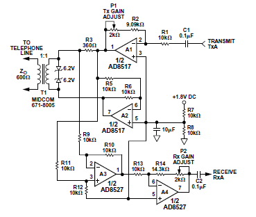 圖5顯示了600 Ω?jìng)鬏斚到y(tǒng)的1.8 V發(fā)射/接收電話線路接口。它允許以差分方式在600 Ω變壓器耦合線路上進(jìn)行全雙工信號(hào)傳輸。放大器A1提供增益,可經(jīng)過調(diào)整以符合調(diào)制解調(diào)器輸出驅(qū)動(dòng)要求。A1和A2均配置成依靠單電源向變壓器施加最高電平信號(hào)。放大器A3配置成差分放大器是出于以下兩個(gè)原因:(1)防止發(fā)射信號(hào)干擾接收信號(hào),(2)從傳輸線路提取接收信號(hào),以便由A4放大。A4的增益可采取與A1相同的方式調(diào)整,以符合調(diào)制解調(diào)器的輸入信號(hào)要求。由于采用標(biāo)準(zhǔn)電阻值,因而可使用SIP(單列直插式封裝)格式的電阻陣列。通過與AD8517的5引腳SOT-23封裝或AD8527的8引腳MSOP及8引腳SOIC封裝耦合,該電路可提供緊湊型解決方案。