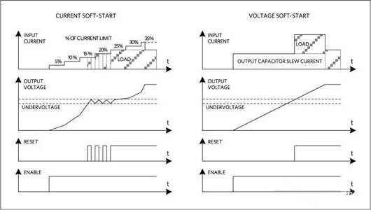 第一種方法是電流軟啟動(dòng)。大多數(shù)穩(wěn)壓器具有電流限值;電流軟啟動(dòng)是緩升或步進(jìn)到該電流限值。由于輸出電容充電量遠(yuǎn)遠(yuǎn)小于最大負(fù)載電流,軟啟動(dòng)使得輸出電壓緩慢上升。電流軟啟動(dòng)的優(yōu)點(diǎn)是穩(wěn)壓器輸入電流穩(wěn)定上升,不會(huì)將負(fù)載啟動(dòng)的瞬態(tài)電流傳遞到輸入。