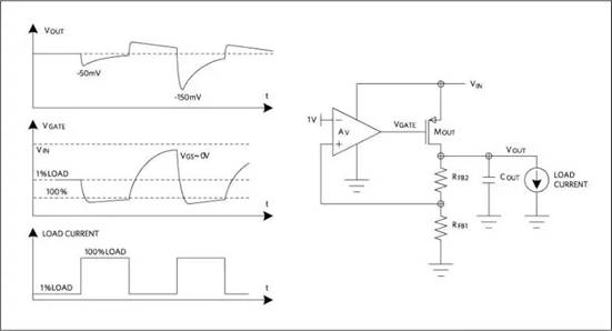 負(fù)載快速變化期間,多數(shù)穩(wěn)壓器都具備一定的能力使輸出保持在穩(wěn)壓范圍內(nèi)。負(fù)載變化時(shí),輸出FET柵極驅(qū)動(dòng)需要隨之變化。而柵極驅(qū)動(dòng)達(dá)到新水平所需的時(shí)間決定了輸出電壓的瞬態(tài)下沖或過沖。