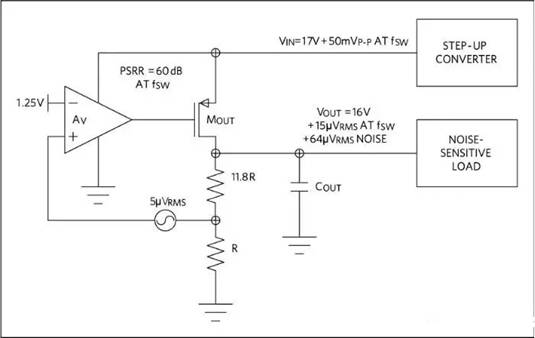 對(duì)于較高的輸出電壓,線性穩(wěn)壓器的輸出噪聲可能成為PSRR的決定因素。這是因?yàn)榉謮汉蟮姆答佪斎朐肼曉龃罅恕<偃缫粋(gè)線性穩(wěn)壓器將噪聲較高的升壓轉(zhuǎn)換器的17V輸出轉(zhuǎn)換為噪聲較小的16V電源,紋波小于100uV。開關(guān)頻率處的PSRR為60dB,50mVP-P升壓轉(zhuǎn)換器紋波將衰減到50uVP-P,或者輸出噪聲15uVRMS。如果采用5uVRMS低噪聲基準(zhǔn)和反饋運(yùn)放輸入,我們來看一下反饋輸入產(chǎn)生的問題。如果反饋輸入調(diào)整在1.25V,電阻反饋網(wǎng)絡(luò)將輸出設(shè)置為16V,那么輸出噪聲將增大到5uVRMSx (16V/1.25V),即64uVRMS,這可能成為主要的噪聲源。(圖5)顯示了高壓輸出造成的輸出噪聲性能下降。