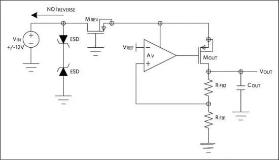 反向電壓保護(hù)允許輸入引腳電壓低于地電位,不會(huì)吸收顯著電流。為達(dá)到這一目的,需要通過串聯(lián)開關(guān)將輸出FET的體二極管斷開。大多數(shù)穩(wěn)壓器都包括二極管,防止任何引腳電壓低于地電位,防止引腳發(fā)生靜電放電,即ESD。為實(shí)現(xiàn)反向電壓保護(hù),也需要去除該二極管的影響,并采取不同的保護(hù)器件,參見(圖6)。