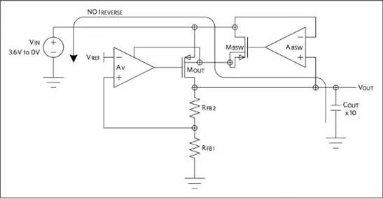線性穩(wěn)壓器的反向電流保護(hù)很容易與反向電壓保護(hù)混淆。盡管效果相似,都是阻斷輸出FET體二極管的反向電流傳導(dǎo),但控制方法完全不同。(圖7)所示為反向電流保護(hù)工作原理。