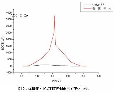 圖2中可以看出采用該改善技術(shù)的英聯(lián)UM3157模擬開關(guān)產(chǎn)品與普通同系列模擬開關(guān)產(chǎn)品在ICCT上的顯著區(qū)別。