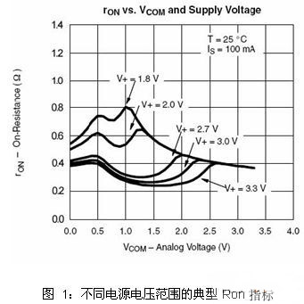低導(dǎo)通電阻往往是模擬開關(guān)在音頻切換時的主要選擇因素。值得注意的是,導(dǎo)通電阻是針對具體的VCC、VIN(電壓輸入)及給定負載電流而指定的。在晶體管級,RON為器件長度(L)、器件寬度(W)、電子與空穴遷移率、氧化層電容、門限電壓及信號電壓的函數(shù)。
