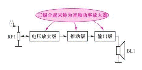 圖2-26所示是音頻功率放大器電路組成方框圖。這是一個(gè)多級(jí)放大器,由前面的電壓放大級(jí)、中間的推動(dòng)級(jí)和后的功放輸出級(jí)共三級(jí)電路組成。