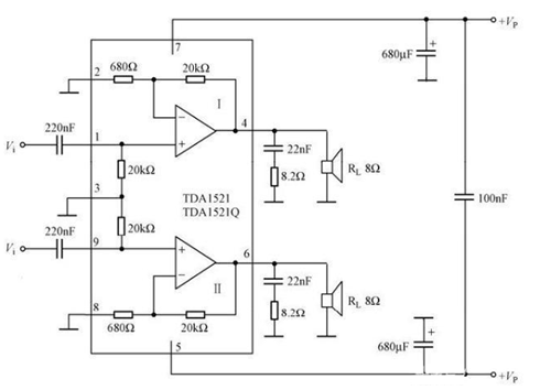 圖中,Vi是信號(hào)的輸入端,兩個(gè)Vi分別接左右兩個(gè)聲道的兩路信號(hào)。左側(cè)方框內(nèi)為T(mén)DA1521芯片的內(nèi)部原理結(jié)構(gòu)。整個(gè)功率放大電路的外接元件僅僅為兩個(gè)電阻和幾個(gè)電容,可見(jiàn),使用TDA1521搭建功率放大電路是非常簡(jiǎn)單的。