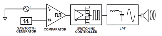 D類放大器可以簡(jiǎn)單地描述為開關(guān)放大器或脈寬調(diào)制(PWM)放大器。下圖顯示了一個(gè)基本D類放大器的信號(hào)流程。