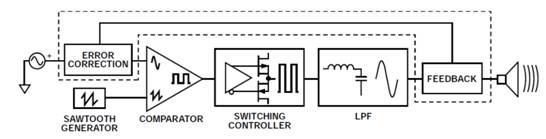 即使D類放大器具有高效率和高功率運(yùn)行優(yōu)勢(shì),某些技術(shù)仍能改善音頻質(zhì)量,例如使用反饋和預(yù)失真機(jī)制。下圖顯示了一個(gè)使用反饋機(jī)制的基本D類放大器。在反饋機(jī)制中,輸出信號(hào)(通常來自濾波器)被送至輸入端的誤差校正模塊。誤差校正模塊可以是全模擬式,或者采用數(shù)字處理故意使音頻信號(hào)預(yù)失真,從而校正輸出瑕疵并改善音頻輸出質(zhì)量。除了揚(yáng)聲器的固有非線性之外,揚(yáng)聲器阻抗因?yàn)闇囟群屠匣兓内呄蛞部赡芤疬@種瑕疵。