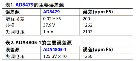表1和表2分別匯總了AD8479和ADA4805-1的主要誤差源。AD8479失調(diào)電壓貢獻(xiàn)的誤差最大,在37.9 V輸入共模電壓下,其為2102 ppm FS。共模電壓貢獻(xiàn)的誤差為1262 ppm FS。這里,對(duì)于37.9 V共模電壓和0.1 檢測(cè)電阻(參見圖1),失調(diào)電壓貢獻(xiàn)的誤差最大,輸入共模電壓次之,不過,如果共模電壓更大,它將成為最大的誤差來源。例如,在250 V共
