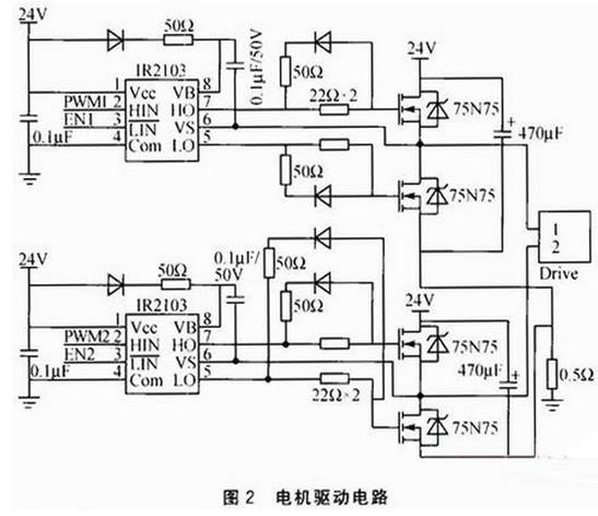 Q1、Q4和Q2、Q3分別組成兩個(gè)橋路,分別控制電機(jī)的正轉(zhuǎn)和反轉(zhuǎn)。高端驅(qū)動(dòng)的MOS管導(dǎo)通時(shí)源極電壓和漏極電壓相同且都等于供電電樂(lè)VCC,所以要實(shí)現(xiàn)MOS管正常的驅(qū)動(dòng),柵極電壓要比VCC大,這就需要專門的升壓芯片IR2103?刂破鳟a(chǎn)生的PWM信號(hào)輸入HIN引腳,控制器I/O口輸出的 EN1、EN2作為使能信號(hào)。輸出端HO就可得到比VCC要高的電壓,且高出的電壓值正好是充在電容兩端的電壓。二極管提高導(dǎo)通速度,使得75N75的導(dǎo)通電阻更小,降低了開關(guān)管的損失。同時(shí)IR2103的兩個(gè)輸出口HO、LO具有互鎖功能,防止由于軟件或硬件錯(cuò)誤造成的電機(jī)上下橋臂直通造成短路。