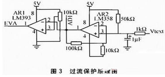 在電機(jī)控制系統(tǒng)中安裝過(guò)流保護(hù)有兩方面的意義:一是防止在電機(jī)正常運(yùn)行時(shí),電機(jī)出現(xiàn)超載或堵轉(zhuǎn)而使得電樞繞組電流過(guò)大損害電機(jī)甚至引發(fā)火災(zāi);另一方面是由于電機(jī)肩動(dòng)時(shí)啟動(dòng)電流很大,往往不能直接啟動(dòng),既需要等勵(lì)磁繞組逐漸建立磁場(chǎng)后再正常運(yùn)行,又希望電機(jī)以盡量快的速度肩動(dòng)起來(lái)。有了過(guò)流保護(hù)對(duì)電流進(jìn)行斬波,可以使電機(jī)安全快速地啟動(dòng)。過(guò)流保護(hù)原理圖如圖3所示。
