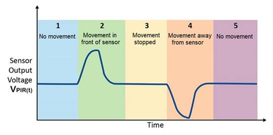 例如,在設(shè)計家庭安防系統(tǒng)等應(yīng)用的電池供電傳感器節(jié)點時,通常會在住宅內(nèi)外使用無源紅外(PIR)傳感器檢測可疑的運動。PIR傳感器可檢測傳感器元件所感知的紅外輻射量的變化,這種變化會因傳感器檢測范圍內(nèi)物體的溫度和表面特性而有所不同。當有人經(jīng)過傳感器檢測范圍時,傳感器會檢測到環(huán)境溫度變?yōu)槿梭w體溫,然后再恢復(fù)至環(huán)境溫度。它會將人進入時所引起的紅外輻射量變化轉(zhuǎn)換為輸出電壓(VPIR(t))的變化。對于與環(huán)境溫度相同但表面特性不同的其他物體,傳感器也會檢測到不同的輻射模式,如圖1所示。