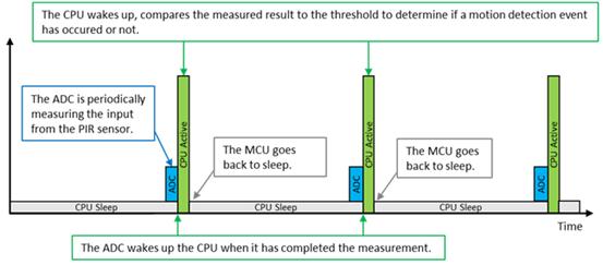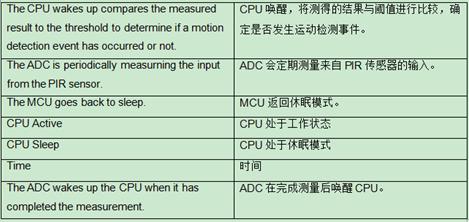 由于MCU具有休眠模式并且可快速喚醒,每個傳感器節(jié)點的功耗都可以達到非常低的水平。節(jié)點可以休眠,當在傳感器檢測范圍內(nèi)出現(xiàn)溫度變化并由此檢測到運動時,節(jié)點就會快速喚醒,并在完成信號處理后返回休眠模式。因此,能夠延長每個電池供電節(jié)點的工作時間,而無需更換電池。請參見圖4,了解使用休眠模式和快速喚醒時CPU的運行方式。功耗取決于具體應(yīng)用,并且會根據(jù)PIR傳感器的配置、采樣時間和濾波參數(shù)而有所不同,這些因素也會影響傳感器的檢測范圍和/或靈敏度。若應(yīng)用需要達到更低的功耗,可以對這些參數(shù)進行調(diào)整,進一步降低功耗。
