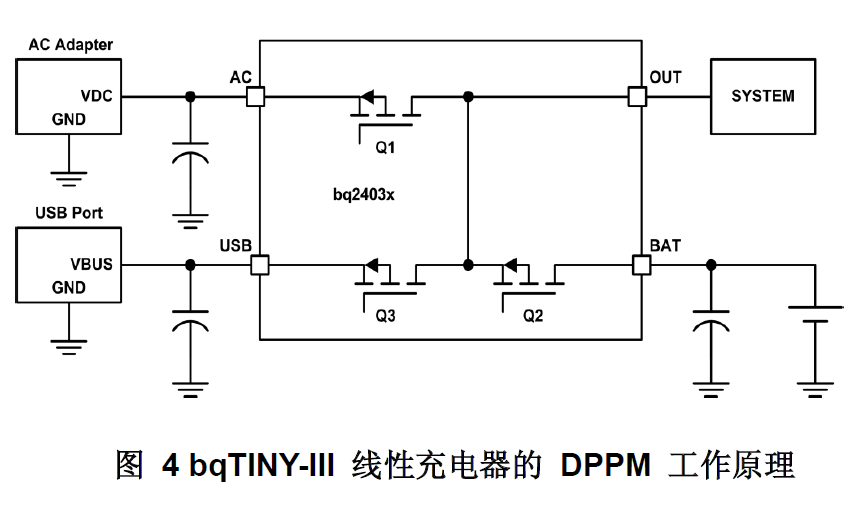 實(shí)施這一方案(最大功率點(diǎn)跟蹤器)的方法有很多,但都非常復(fù)雜,尤其是在衛(wèi)星等任務(wù)關(guān)鍵型系統(tǒng)中。然而,在很多小型應(yīng)用中,并不需要極其精確的MPP跟蹤方案,只需要一個(gè)能利用率約90%-95%可用電能的簡單低成本解決方案即可。TI線性充電控制器bqTINY-III系列的動(dòng)態(tài)電源路徑管理(DPPM)功能就可用于諸如簡化MPP跟蹤器的實(shí)施。DPPM功能的主要原理如圖4所示。暫時(shí)忽略USB輸入,電路的工作原理如下:Q1對(duì)OUT引腳的電壓進(jìn)行調(diào)節(jié),Q2根據(jù)一個(gè)典型的CC-CV鋰離子充電曲線對(duì)充電電流進(jìn)行調(diào)節(jié)。如果連接至AC引腳的電源電流不足而無法為系統(tǒng)供電并為電池充電,則VOUT開始下降。如果VOUT達(dá)到了預(yù)定義的閾值VDPPM,bqTINY-III則會(huì)自動(dòng)將充電電流降至一個(gè)可保持VDPPM時(shí)VOUT的水平。