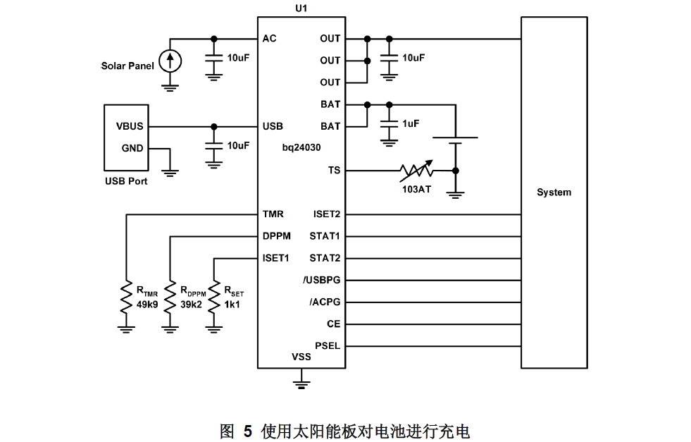 bqTINY-III還允許通過USB端口對(duì)電池進(jìn)行充電。在這種情況下,Q3就會(huì)被用來調(diào)節(jié)輸入電流,以確保USB規(guī)范可根據(jù)IC的ISET2引腳狀態(tài)滿足100mA或500mA的要求。如果系統(tǒng)和充電電流的總和超過了所選USB的電流極限,則VOUT就會(huì)下降且DPPM功能會(huì)降低充電電流,或像從前那樣還原為電池補(bǔ)充模式。bqTINY-III系列器件的另一個(gè)非常有用的特性就是如果充電器正處于DPPM狀態(tài),則其內(nèi)部安全定時(shí)器就會(huì)自動(dòng)延長時(shí)間。因此在低光照或電流限制的條件下,當(dāng)電池充電速度較慢時(shí),在出現(xiàn)錯(cuò)誤條件之前對(duì)電池進(jìn)行再充電所允許的時(shí)長得到了適當(dāng)?shù)难娱L,從而避免了過早的充電終止。