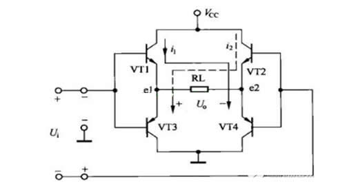 電源電壓VCC加到放大管VT1,VT2的集電極,為他們供電。靜態(tài)時(shí),由于沒(méi)有信號(hào)輸入,放大管VT1~VT4截止,無(wú)電壓輸出,RL上無(wú)電流流過(guò)。當(dāng)輸入U(xiǎn)i的正半周信號(hào)時(shí),VT1和VT4導(dǎo)通,它們的集電極電流由VCC經(jīng)VT1,RL,VT4到地構(gòu)成回路,形成輸出信號(hào)的上半周;當(dāng)輸入U(xiǎn)i的負(fù)半周信號(hào)時(shí),VT2,VT3導(dǎo)通,它們的集電極電流由VCC,VT2,RL,VT3到地構(gòu)成回路,形成輸出信號(hào)的負(fù)半周。這樣,就可以得到一個(gè)完整的信號(hào)。
