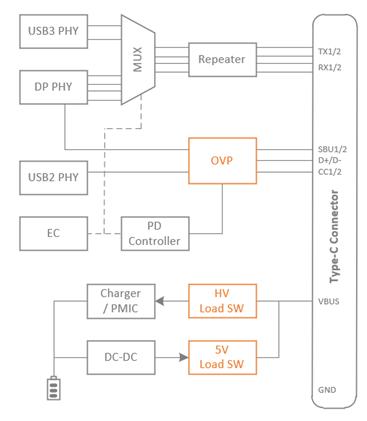 相比早期版本的其他 USB 接口,Type-C 的 VBUS 引腳更容易由于異物或異常插拔與相鄰引腳發(fā)生短路。由于 VBUS 的電壓典型可能高達(dá) 20V ,與低壓引腳之間(如CC、SBU、Tx/Rx 等)發(fā)生短接會造成嚴(yán)重后果。其次,Type-C 應(yīng)用的電源路徑需要具有大電流通流能力,對潛在的負(fù)載短路、過電流等危險做出有效防護(hù)。此外,作為電子設(shè)備的外接接口,ESD 和浪涌的侵害必須從系統(tǒng)層面加以重視,熱插拔等原因造成的過電壓也必須加以考慮。