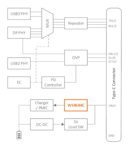 WS4684C-15/TR、WS4683C-16/TR 和 WS3233Q-20/TR 的組合實現(xiàn)了對過壓、過流、過溫、浪涌、ESD 等各種常見干擾異常的保護(hù)和抑制,是業(yè)界完善的 USB Type-C 接口保護(hù)方案之一。