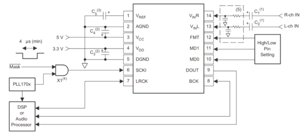 ADC輸入是單端而且內(nèi)部通過20kΩ電阻偏置在共模電壓(50%*VCC)(典型@fs=48kHz)。輸入信號范圍隨著電源電壓擴(kuò)張,正常情況為 0.6*VCC Vpp(典型)。ADC 輸出數(shù)據(jù)格式是二進(jìn)制的補(bǔ)碼。內(nèi)部高通濾波器消除直流失調(diào)電壓。
