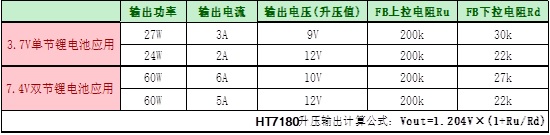 HT7180應(yīng)用于單節(jié)鋰電池升壓、雙節(jié)鋰電池升壓典型參數(shù)如下: