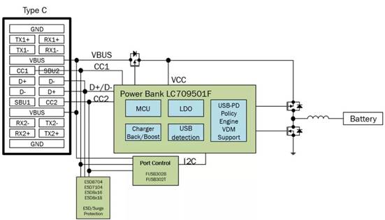 為了支持PD的所有功能,包括使用VDM的快速充電,移動(dòng)電源制造商將需要轉(zhuǎn)向設(shè)計(jì)一個(gè)智能控制器來(lái)提供通過(guò)USB PD提供的功能。例如安森美半導(dǎo)體的LC709501F。這高度集成的基于Flash的可配置設(shè)備匯集了所需的所有功能,通過(guò)多個(gè)USB接口管理鋰離子電池提供的電源。圖2所示為一個(gè)典型的應(yīng)用示例。