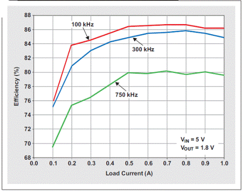 三個例子的重要損耗組成部分,來自于FET驅(qū)動損耗、FET開關(guān)損耗和電感損耗。FET電阻和IC損耗是一致的,因為所有三個設(shè)計中都使用了相同的IC。由于所有例子中都選擇了低ESR的陶瓷電容,因此電容損耗可以忽略不計。為了表明高頻開關(guān)的影響,我們對每個例子的效率都進(jìn)行了測量,并將其顯示在圖2中。該圖清楚地表明,效率隨開關(guān)頻率增加而下降。若想提高所有頻率下的效率,需要尋找到一種全負(fù)載狀態(tài)下低漏到源“導(dǎo)通”電阻、低門電荷或者低靜態(tài)電流規(guī)范的DC/DC轉(zhuǎn)換器;或者尋找到一些具有更低等效電阻的電容和電感。