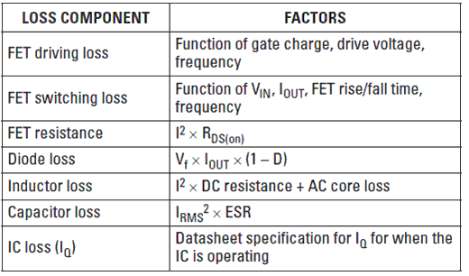 DC/DC轉(zhuǎn)換器的效率,是進(jìn)行電源設(shè)計時需要考慮的最重要屬性之一。低效率會轉(zhuǎn)換成高功耗,必須要在印刷電路板(PCB)上使用單獨的散熱器或者更多的銅,才能處理這些功耗。功耗也對電源上游器件提出了更高的要求。如表3所示,功耗共有幾個組成部分。