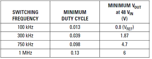 最小可控“導(dǎo)通”時間限制是DC/DC轉(zhuǎn)換器IC的一個特點,其為脈寬調(diào)制(PWM)電路的最窄可達(dá)脈寬。在降壓轉(zhuǎn)換器中,開關(guān)周期期間功率MOSFET導(dǎo)通的時間百分比被稱作占空比,其等于輸出電壓與輸入電壓的比。使用TPS54160轉(zhuǎn)換器時,占空比為0.104(4 V/48 V),而數(shù)據(jù)表中列出的最小“導(dǎo)通”時間為130 ns?煽孛}寬限制產(chǎn)生一個最小可達(dá)占空比,而用最小“導(dǎo)通”時間乘以開關(guān)頻率,我們可以輕松地計算出該占空比的大小。一旦知道了最小占空比,利用VIN乘以最小占空比,我們便可以計算出最低可達(dá)輸出電壓。最低輸出電壓同樣也受轉(zhuǎn)換器基準(zhǔn)電壓的限制,使用TPS54160時其為0.8V。