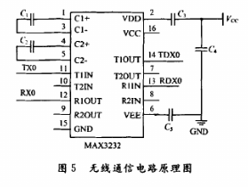 通過(guò)串口驅(qū)動(dòng)電路中的RS 232電平轉(zhuǎn)換芯片,可以實(shí)現(xiàn)單片機(jī)和PC機(jī)之間的通信,建立人-機(jī)對(duì)話(huà)活動(dòng)的通道。桑銳公司生產(chǎn)的SRWF-1型無(wú)線(xiàn)通信模塊工作性能穩(wěn)定,體積小便于安裝。利用MAX3232芯片,能夠完成TTL電平和RS 232電平之間的轉(zhuǎn)換,實(shí)現(xiàn)通信模塊與PC機(jī)進(jìn)行串口通信。其電路原理圖如圖5所示。