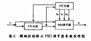 模糊PID控制器的原理是把輸入PID調(diào)節(jié)器的偏差e和偏差變化率ec同時(shí)輸入到模糊控制器中。圖中的F控制器實(shí)際上是由三個(gè)分模糊控制器組成的,分別對(duì)三個(gè)參數(shù)進(jìn)行調(diào)節(jié),然后分別經(jīng)過(guò)模糊化、近似推理和清晰化后,把得出的修正量分別輸入PID調(diào)節(jié)器中,對(duì)三個(gè)系數(shù)進(jìn)行實(shí)時(shí)在線(xiàn)修正,從而使被控對(duì)象具有良好的動(dòng)態(tài)和靜態(tài)性能。