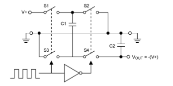 閉合S1和S3會在前半個周期將飛跨電容器C1充電至V +。在下半部分,S1和S3打開,S2和S4關(guān)閉。此動作將C1的正極連接到地,并將負(fù)極連接到VOUT。C1然后與儲能電容器C2并聯(lián)。如果C2兩端的電壓小于C1兩端,則電荷從C1流到C2,直到C2兩端的電壓達到-(V +)。