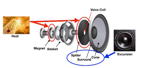 揚聲器的第二個問題是,當(dāng)電流通過音圈時,一些能量會轉(zhuǎn)化為熱量而不是聲音。用力推揚聲器,這種加熱可能會熔化電磁線上的清漆,從而損壞音圈。當(dāng)音圈從放大器傳遞的能量中加熱時,音圈必須通過磁鐵冷卻到周圍的結(jié)構(gòu)中。在傳統(tǒng)的放大器中,最大功率被限制在一個值,如果連續(xù)提供,則不會損壞揚聲器。該最大功率值必須涵蓋所有揚聲器變化,工作條件和信號。因此,此值通常低于揚聲器可以處理的值,因此比較保守。