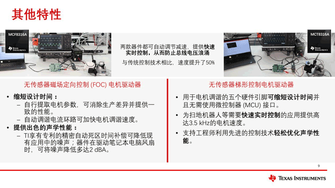本次推出兩款新產(chǎn)品,分別是MCF8316A和MCT8316A。前者采用磁場定向控制技術(shù),后者梯形控制技術(shù),無需傳感器,通過這兩款產(chǎn)品,可以把整個(gè)電機(jī)方案的尺寸減少70%。