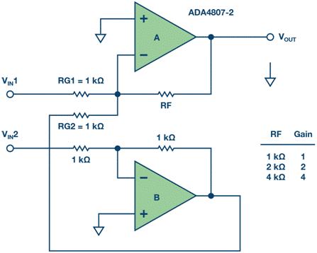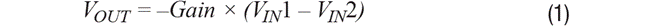 其中,增益=RF/1k,且(VIN1–VIN2)是差分輸入電壓。
