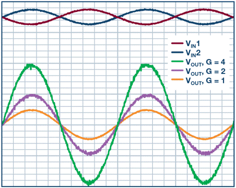 圖2顯示的是施加差分輸入電壓和電路增益變動(dòng)的情況。RF值可設(shè)置系統(tǒng)增益?梢钥吹,這張圖顯示的是系統(tǒng)增益1、2和4,且1kHz時(shí)的差分輸入電壓為1Vp-p。