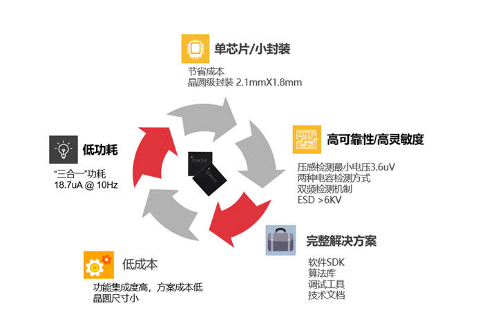 SRAM。其內(nèi)部集成了高精度ADC、1024倍增益放大的超低噪聲PGA,可實現(xiàn)高達21.5位的信號鏈有效精度,并配備了Offset自動消除硬件電路,可實現(xiàn)uV級小信號在各種環(huán)境干擾和溫度漂移下的精準測量。泰矽微還開發(fā)了獨創(chuàng)的降低系統(tǒng)整體功耗的Tinywork®技術(shù)(專利號:CN111427443A),使得外設(shè)在睡眠模式下,無需內(nèi)核處理器的干預也能獨立工作和相互協(xié)同,可將典型應用場景的工作電流降低80%以上。外加超低功耗的睡眠模式設(shè)計,在TWS耳機人機交互應用場景中,將壓力檢測,滑條及入耳檢測三種功能融合下的典型應用功耗控制在18uA左右,引領(lǐng)行業(yè)標桿水準。TCAE系列MCU具有高可靠性的典型特征,高達6kV的ESD設(shè)計免除了外部器件防護的需求,有利于非常局限的狹小空間中的硬件設(shè)計。