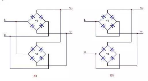 在小功率設(shè)計(jì)中,一般很少用到整流橋的并聯(lián),但在某些大功率輸出的情況下,不想增添新的器件單個(gè)整流橋電流又不滿足輸入功率要求,就需要用到整流橋的并聯(lián)了,整流橋的并聯(lián)不能采用兩個(gè)整流橋各自整流后直流并聯(lián)的方式,也就是不能采用圖1的方式,因?yàn)檎鳂驔]有配對(duì),單純靠自身的V-I特性,一般是無法均流的,這樣就會(huì)造成兩個(gè)整流橋發(fā)熱不一致。而采用圖2的方式,通常認(rèn)為在一個(gè)封裝內(nèi)的兩個(gè)二極管是非常匹配的,是可以均分電流的,所以采用圖2的方式就可以實(shí)現(xiàn)整流橋的并聯(lián)了。