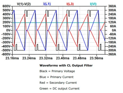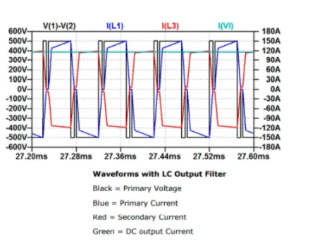 這是本質(zhì)上是隔離的單向轉(zhuǎn)換器。它的初級(jí)繞組借助于單相H橋逆變器來驅(qū)動(dòng)。直流輸出是通過全橋整流器產(chǎn)生的,并且為了直流輸出的清潔度需要一個(gè)輸出濾波器,可以是CL或LC。帶有LC和CL濾波器的DC-DC轉(zhuǎn)換器如圖1所示。在CL濾波器的情況下,不需要整流二極管來整流二極管。由于整流器電流不連續(xù),H橋中的電流波形為三角形。較高的電流峰值導(dǎo)致三角波形效率低下。如圖2所示,在400直流輸出和500直流輸入下有120A電流充電。使用LC輸出濾波器會(huì)產(chǎn)生連續(xù)電流,該連續(xù)電流會(huì)在H橋中產(chǎn)生具有低電流峰值的方波。與使用LC濾波器有關(guān)的另一個(gè)優(yōu)勢是效率高[1]。LC濾波器的波形如圖3所示。