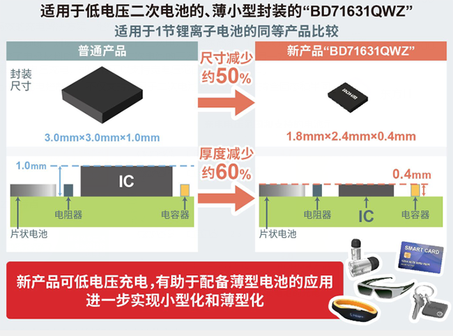 新產(chǎn)品通過提高IC內(nèi)部的電路穩(wěn)定性,實現(xiàn)了從2.0V到4.7V的寬充電電壓范圍,不僅支持鋰離子電池等傳統(tǒng)二次電池的充電,還支持需要低電壓充電的新型二次電池*1(如近年來開發(fā)的全固態(tài)和半固態(tài)電池)的充電。普通充電控制IC的充電電壓是固定的,但新產(chǎn)品只需改變外部電阻即可輕松設(shè)置充電電壓,這也有助于減少更換電池等工作所需的設(shè)計工時。此外,采用ROHM自有的封裝技術(shù),實現(xiàn)了厚度僅為0.4mm的薄型封裝(比普通產(chǎn)品薄60%),有助于應(yīng)用設(shè)備的進(jìn)一步小型化和薄型化。不僅如此,由于可以設(shè)置CCCV*2充電的各項充電特性(充電電流、終止電流等),因此能夠為搭載新型二次電池的可穿戴設(shè)備和小而薄的物聯(lián)網(wǎng)設(shè)備提供理想的充電環(huán)境。
