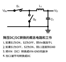 降壓DC/DC轉(zhuǎn)換是借著開關(guān)將DC電壓VIN做時(shí)間分割后以電感和電容器使其平滑化來轉(zhuǎn)換成所希望的DC電壓。降壓DC/DC轉(zhuǎn)換的概念電路和工作如右所示。