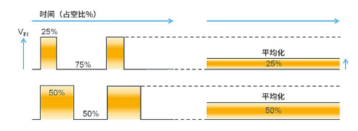 以PWM工作來說明,以S1=ON/S2=OFF將VIN供電時(shí)間設(shè)為25%、以S1=OFF/S2=ON將0V(GND)狀態(tài)設(shè)為75%的脈沖周期,當(dāng)該脈沖平均化時(shí)將為25%的DC。如果VIN為10V,則Vo將為25%的2.5V。