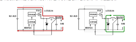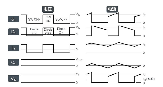 與基準(zhǔn)電壓進(jìn)行比較,檢查輸出電壓是否為設(shè)定電壓低于設(shè)定電壓時(shí),開關(guān)變?yōu)镺N,從輸入向輸出供電。此時(shí),電感會(huì)蓄積磁能,如果輸出電壓高于設(shè)定電壓,則開關(guān)OFF電感所蓄積的磁能變?yōu)殡娏鞅还┩敵鲐?fù)載,再返回電感電感的磁能消失,輸出電壓開始下降時(shí),開關(guān)會(huì)再度為ON實(shí)際電流及電壓的開關(guān)波形也有記載。S1為MOSFET的開關(guān)晶體管、D1為肖特基二極管、L1為電感、C1為輸出電壓、VIN為輸入電壓。