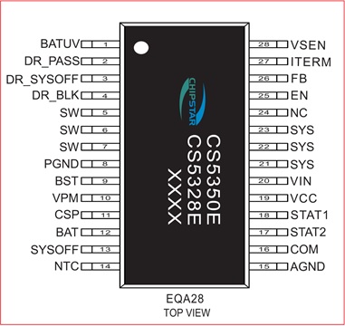 CS5328 CS5328E是一款24V耐壓,異步降壓型鉛酸電池充電管理IC。集成功 率MOS,具有最大5A的充電電流能力,充電電流可以通過外部電阻靈活可調(diào)。 EQA-28 3.6V-24V 具有太陽能板最大功率點跟蹤功能,低功耗運(yùn)輸模式,電源路徑管理,