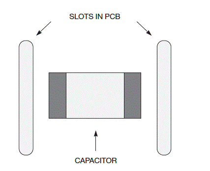 添加第二個電容器會增加成本,但不及將噪聲電容器替換為可能不會產(chǎn)生噪聲的電容器要多。Digi-Key的陶瓷電容器售價約為27美分(1000)。Kemet的KPS系列靜音部件的價格約為1.50美元。第二種方法涉及在PCB的電容器兩端附近制作一個插槽(圖2)。當(dāng)電容器膨脹和收縮時,它僅使PCB的一小部分彎曲,這將減少噪聲。