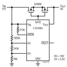 圖 1 示出了一款完整的應(yīng)用電路。一個(gè)阻性分壓器負(fù)責(zé)設(shè)定用于負(fù)載與VIN連接 / 斷接的過(guò)壓(OV)和欠壓 (UV) 跳變點(diǎn)。如果輸入電源漂移至該電壓窗口之外,則LTC4365 將迅速把負(fù)載與電源斷接。