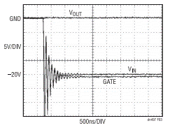 圖 3 示出了當(dāng) VIN 帶電插入至 –20V 時(shí)出現(xiàn)的狀況。在連接的前一刻,VIN、VOUT 和 GATE 以地電位為起始點(diǎn)。由于 VIN 和 GATE 連接線的寄生電感之原因,VIN 和 GATE 引腳上的電壓將顯著地變至 –20V 以下。外部 MOSFET 必須具有一個(gè)可安全承受該過(guò) 沖的擊穿電壓指標(biāo)。