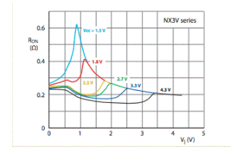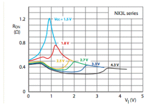 NX3L和NX3V器件的低導通電阻和低Ron平坦度的結(jié)合(請參見下面的曲線)極大地降低了開關信號的衰減和失真,從而消除了許多應用中對緩沖放大器的需求。