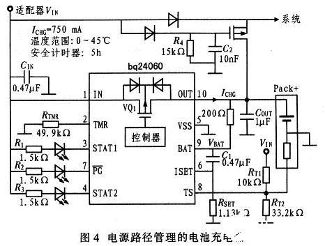 許多應(yīng)用都要求在電池充電同時(shí)給系統(tǒng)供電。如圖l所示,系統(tǒng)直接連接到電池充電輸出,系統(tǒng)和充電器間的相互影響會(huì)使安全計(jì)時(shí)器生成錯(cuò)誤充電終止信息。圖4為能夠解決上述問(wèn)題的典型應(yīng)用電路。這里有兩個(gè)獨(dú)立的電源路徑,一個(gè)給電池充電,另一個(gè)給系統(tǒng)供電。如果AC適配器不可用,那么電池放電MOSFET在R4和C2設(shè)置的時(shí)間延遲之后就會(huì)打開(kāi),這樣電池就能給系統(tǒng)供電了。