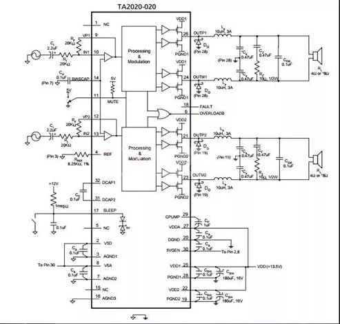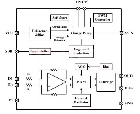 上圖是TA2020的內(nèi)部模塊構(gòu)造,從上圖上可以看出,該芯片內(nèi)部主要集中了處理和調(diào)制模塊,從而實(shí)現(xiàn)高品質(zhì)音頻的特性。
